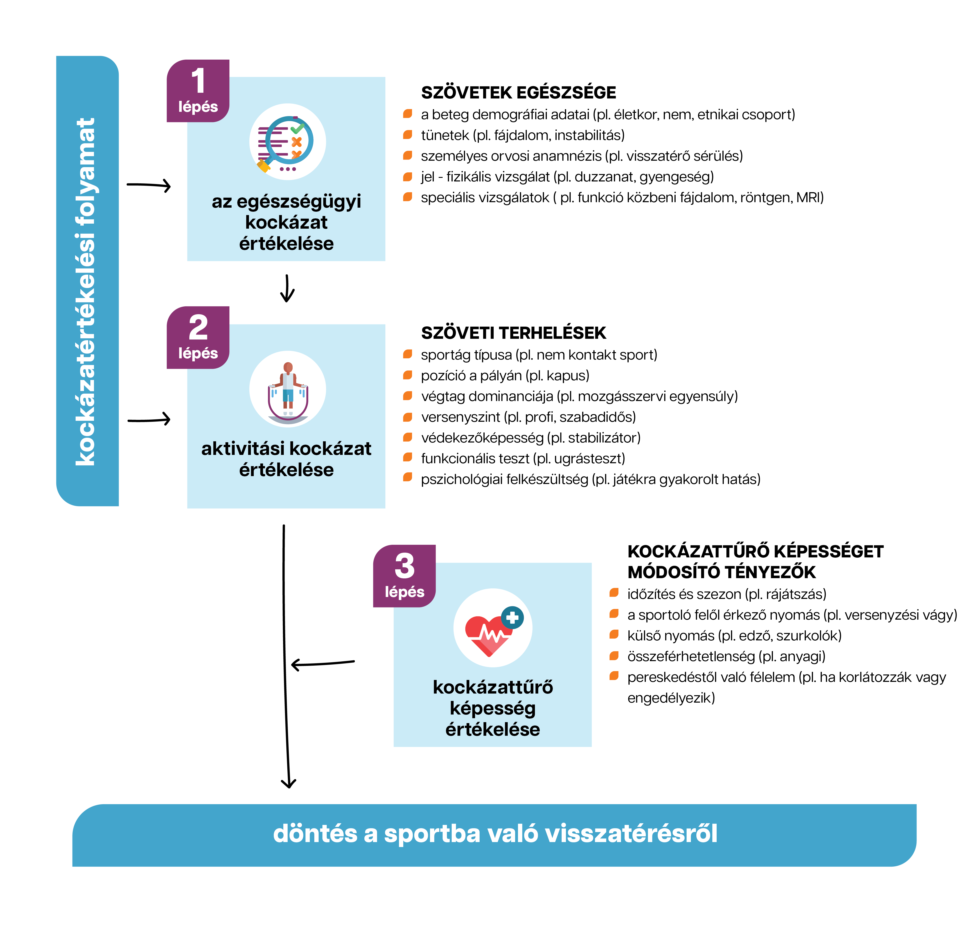 A sérülés után a sporthoz való visszatéréssel kapcsolatos döntésnek figyelembe kell vennie a páciens klinikai és mentális állapotát, valamint rövid és hosszú távú sportcéljait. Egy ilyen döntés meghozatalakor mindig próbáljon meg egyensúlyt találni a sportoló egészsége és pályán való eredményessége között. Sajnos ez mindig kockázattal jár. A túl korai visszatérés negatív következményekkel járhat a sportoló egészségére nézve (pl. újból megsérülhet), a túlzott óvatosság és a visszatérésre vonatkozó döntés késleltetése miatt lemaradhat fontos versenyekről és kimaradhat a csapatból. A sporthoz való visszatérésre vonatkozó döntést általában több ember véleménye is alátámasztja. Fontos az orvos és a gyógytornász szerepe, de a pszichológus, az edző és a sportoló legközelebbi környezetének véleménye is. Azonban maga a sportoló hozza meg a végső döntést. Ezen a ponton nagyon fontos a sérülés természetére és következményeire vonatkozó felvilágosítás, mivel kutatások szerint a sportolók gyakran hagyják figyelmen kívül a hosszú távú egészségügyi prognózist és döntenek úgy, hogy a rövid távú sportsiker érdekében a lehető leghamarabb visszatérnek a sporthoz. A sportolók általában akkor döntenek könnyen úgy, hogy túl korán térnek vissza a sporthoz, amikor kockázatcsökkentő tényező áll rendelkezésükre. Ez lehet egy utasítás arra, hogy viseljen stabilizátort a tevékenység időtartama alatt, vagy hogy 100% -nál kisebb aktivitást fejtsen ki, esetleg addig játsszon, amíg nem fáj, „bármikor lejöhetsz a pályáról, valaki majd beáll helyetted”. A sportoló jóllétére való tekintettel, a sporthoz való visszatérésre vonatkozó döntést tudatosabban, alapos egészségügyi és kockázatelemzés alapján célszerű meghozni. A StARRT-hez hasonló nomatív eszközök ebben segíthetnek.