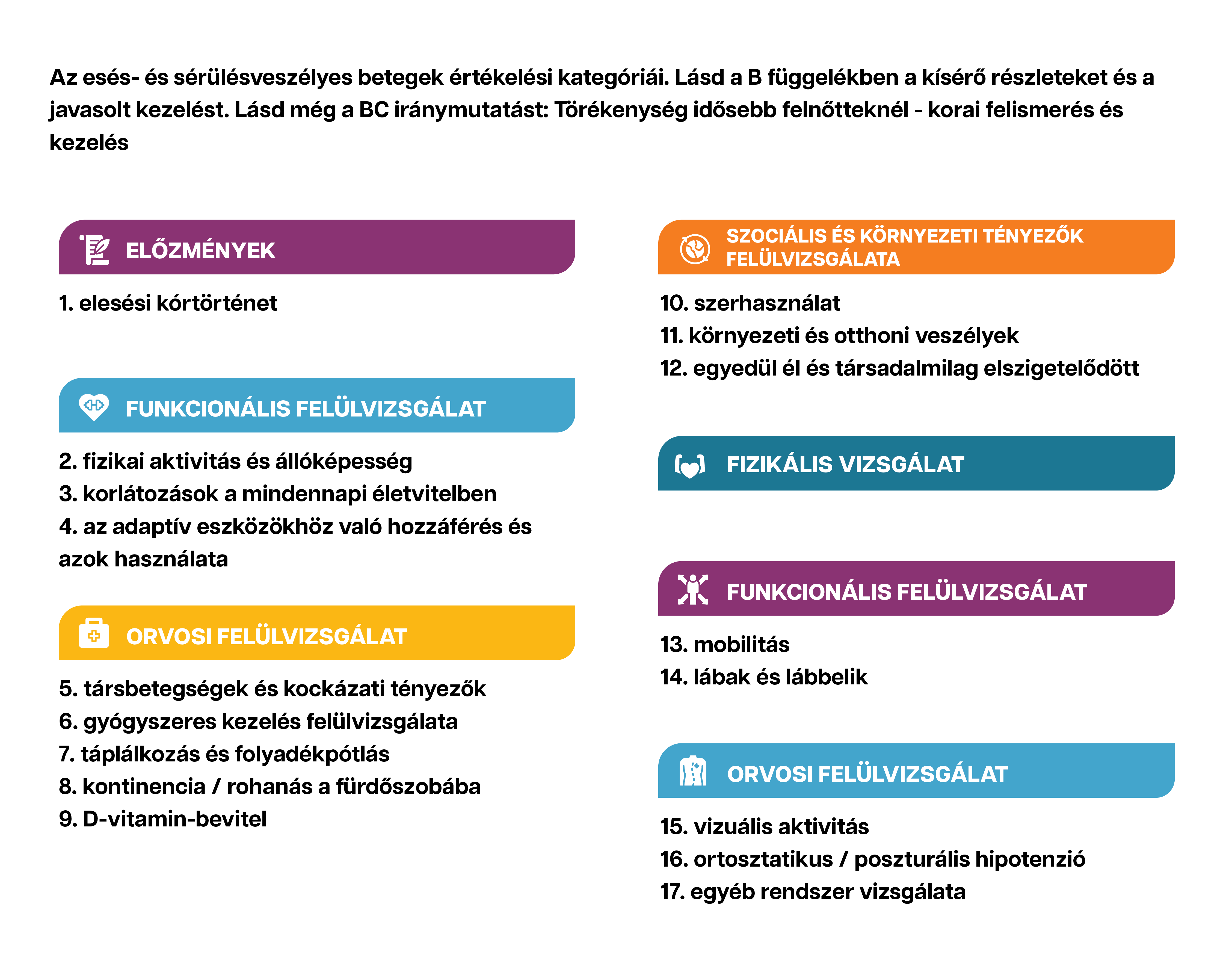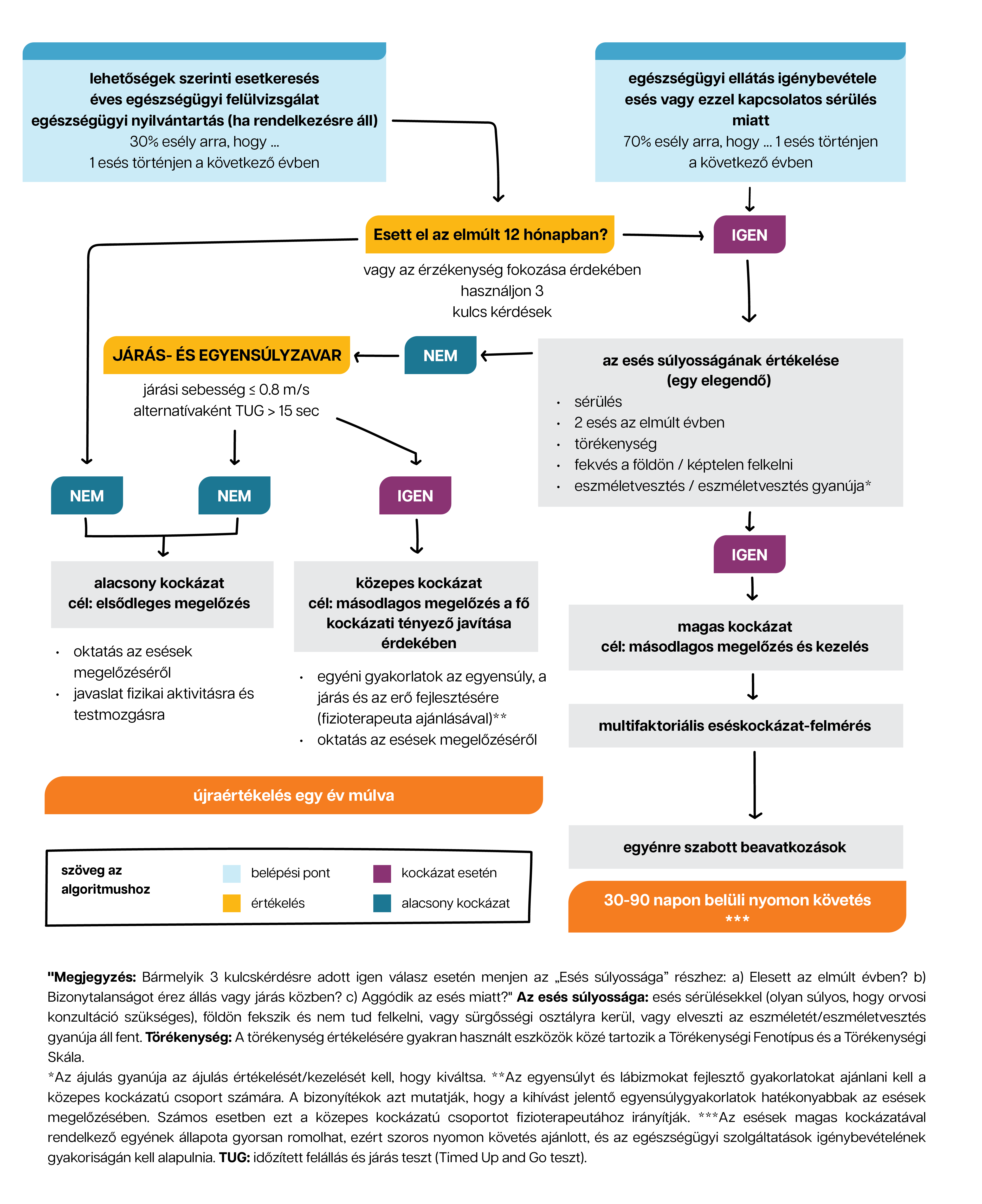 Az elesés kockázatának becslésénél érdemes figyelembe venni a beteg életkorát és személyes jellemzőit, információkat rögzíteni a korábbi esések/esések anamnéziséről, a gyógyszeres kezelési szokásokról, egyéb egészségügyi állapotokról, egyensúlyi képességekről, aktivitási szintről, fizikai és koordinációs képességekről, reaktivitásról, érzékszervi képességekről. (különösen a vizuális) megfelelőség, sőt, ha lehetséges, a kognitív funkció is. Az esések kialakulásában a lábműködés (diabetes mellitusban kialakuló polyneuropathia esetén) és a környezeti jellemzők is fontos szerepet játszanak
